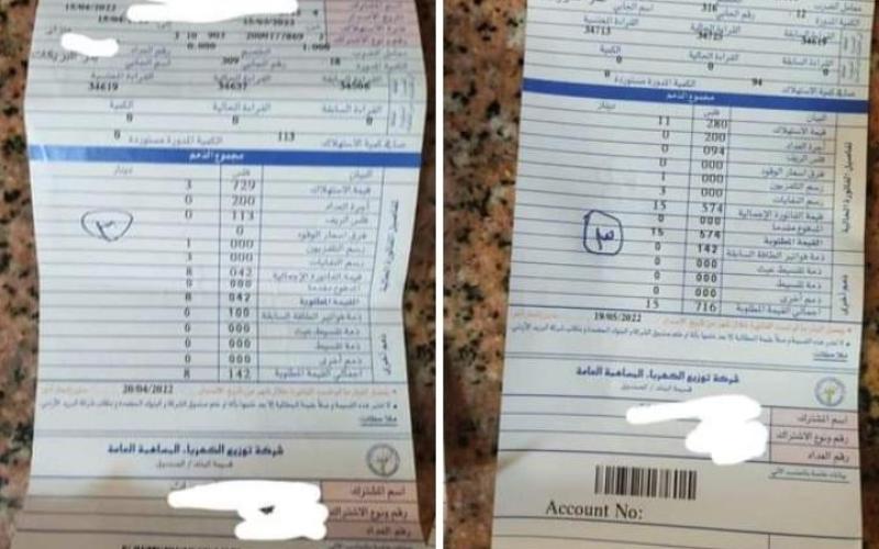 المواطن أحمد ( اسم مستعار ) يقول أن قيمة استهلاك الكهرباء للشهر الماضي الصادرة بتاريخ (١٥/٤/٢٠٢٢) كانت ١١٣ كيلو وصرف الفاتورة الحالية الصادرة بتاريخ ( ١٥/٥/٢٠٢٢) كانت ٩٤ كيلو، مع العلم ان سعر الكيلو٣٣ قرشا لمن كان استهلاكهم من (١-١٦٠) كيلوا واضاف احمد انه يسكن في عمارة مكونه من اربع طوابق وهناك شقتين فارغات لا يسكنها أحد أتت الفاتورة لأحدهم بقيمة (٢٠ دينار) والاخرى (16 دينار ) فقط مقطوعية .