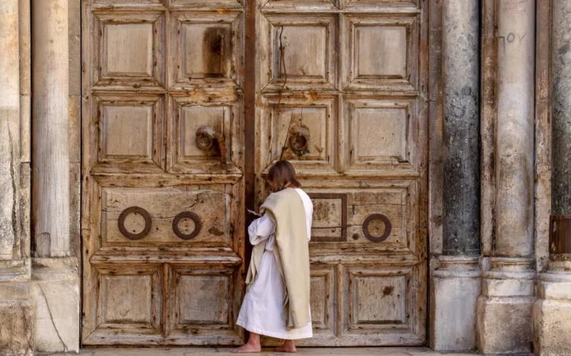الأحد الماضي، فرغت أزقة البلدة القديمة في القدس من الناس، لكن رجلا متشبها بالمسيح، أرخى شعره وارتدى رداء أبيض وسار حافي القدمين، كسر صمت المدينة إذ شوهد يتكئ على عصا حاملا الكتاب المقدس ويصلي في ساحة كنيسة القيامة أمام أبوابها الخشبية المغلقة.
