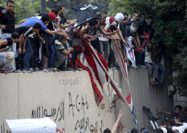 وقام المحتجون بتسلق أسوار السفارة، ومزقوا العلم الأمريكي وأحرقوه، والذي كان منكسا بمناسبة ذكرى أحداث الحادي عشر من أيلول.