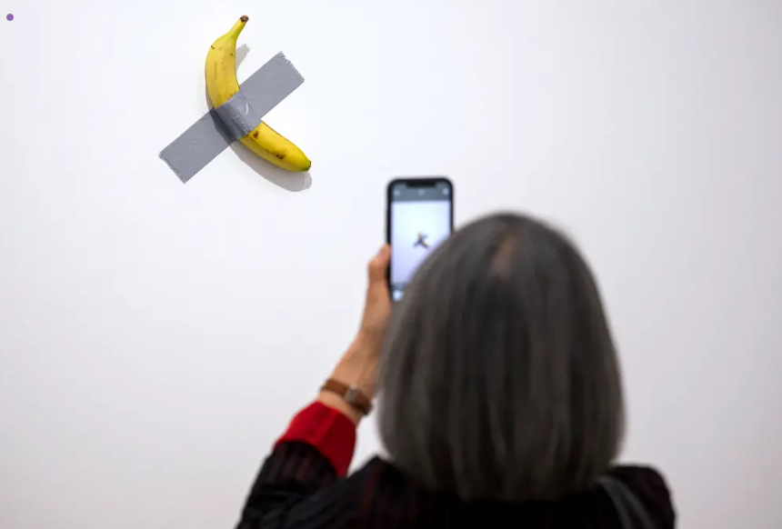 العمل لا يزيد عن كونه موزة حقيقية مثبتة على جدار بشريط لاصق، لكنها بيعت مؤخراً في مزاد بمدينة نيويورك مقابل أكثر من 6 ملايين دولار.