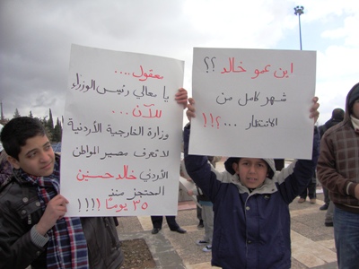وحمل المشاركون لافتات كتب عليها:"ما عندكم عيال؟ .. اين ابني خالد؟ ..35 يوما من الترقب والانتظار" و "اذا لم يكن لديكم رد فمن نسأل ..من نسأل؟ .. اجيبونا يا حكومتنا؟" و" أين عمو خالد؟ ..شهر كامل من الانتظار" .