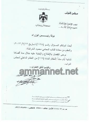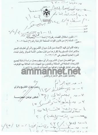 وأوضح الخرابشة لبرنامج "المجلس" الذي يبث على أثير راديو البلد الاثنين، أن الحكومة أرسلت جوابا بأن عدد القوانين التي يجب تعديلها لتتواءم مع التعديلات الدستورية هي 12 قانونا؛ رداً عن سؤال رقم 1198 تقدم به في شهر أيلول عام 2013.