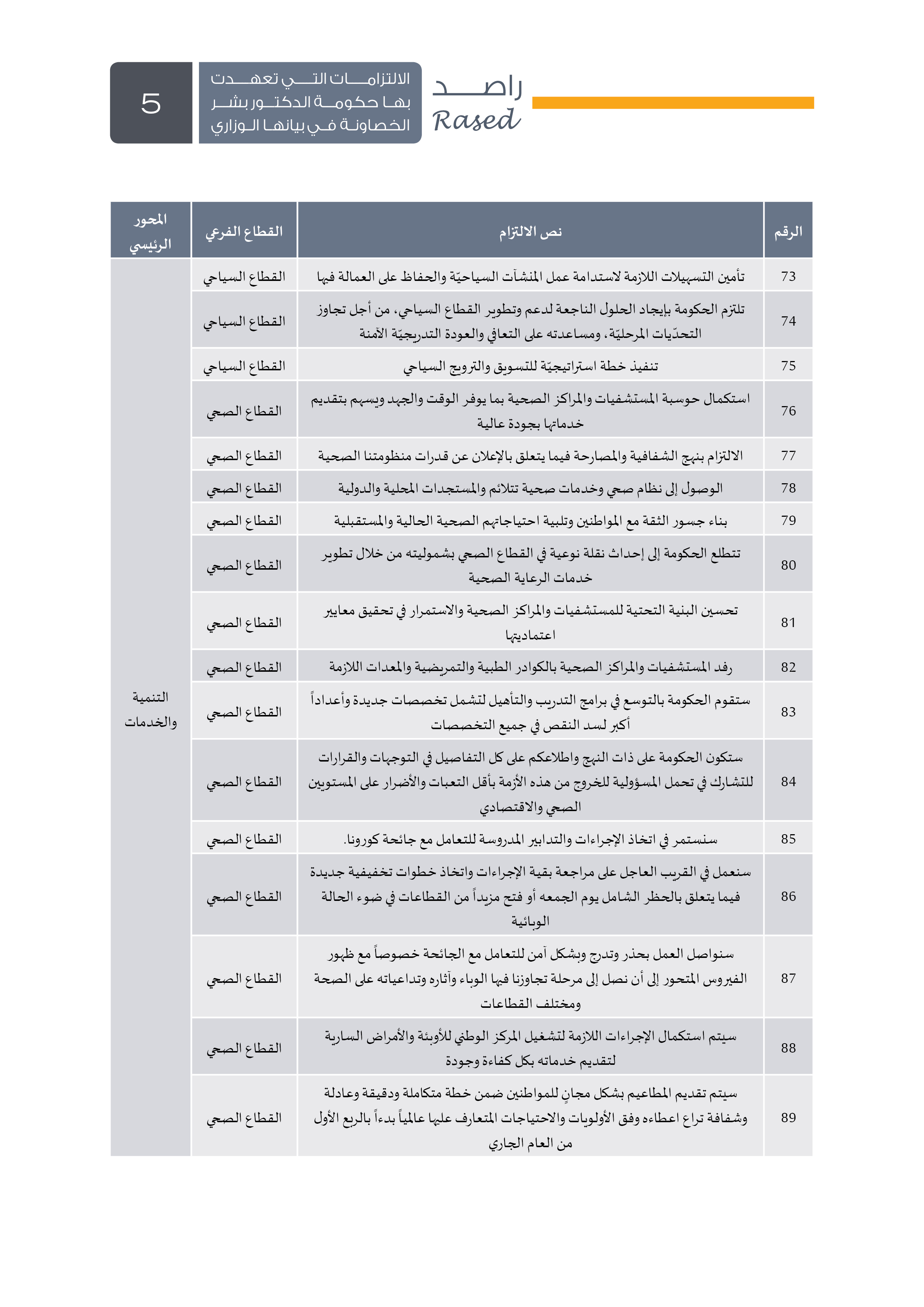 قدمت الحكومة خلال بيانها الوزاري الذي تلته يوم الأحد الموافق 3/1/2020 من خلال رئيس وزرائها الدكتور بشر الخصاونة ما مجموعه 157 التزاماً، وتم تحليل البيان إلى سبعة محاور شاملة وكان محور تعزيز التنمية والخدمات هو الأكثر بعدد الالتزامات بواقع 88 التزاماً، تلاه محور الإصلاح الاقتصادي بـ 33 التزاماً، ثم محور الإصلاح الإداري ومكافحة الفساد بـ 17 التزاماً، ثم محور حقوق الإنسان ودعم القضاء بـ 8 التزامات، ثم محور الشفافية والإعلام بـ 5 التزامات، ومحور الشؤون الخارجية بـ 4 التزامات وأخيراً المحور السياسي بالتزامين فقط.