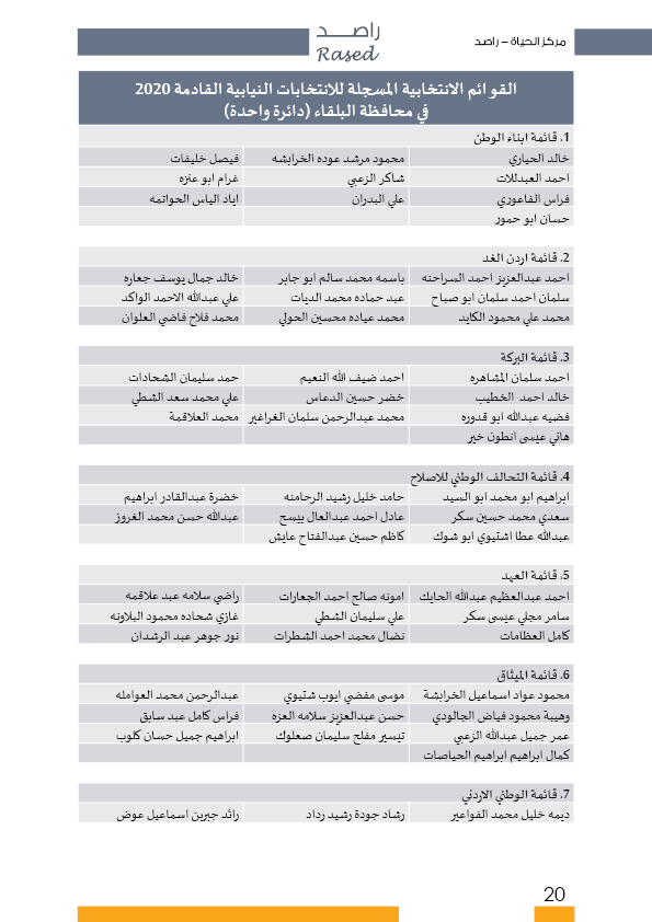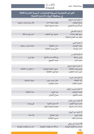 وتبين أن أعلى الدوائر الانتخابية تسجيلاً للقوائم هي دائرة الكرك الانتخابية بـ 16 قائمة انتخابية، تلتها عمان الثانية بـ 15 قائمة انتخابية، تلتها دائرة البلقاء الانتخابية بـ 14 قائمة انتخابية، وكانت دائرة بدو الجنوب الأقل تسجيلاً للقوائم الانتخابية بـ 4 قوائم انتخابية.