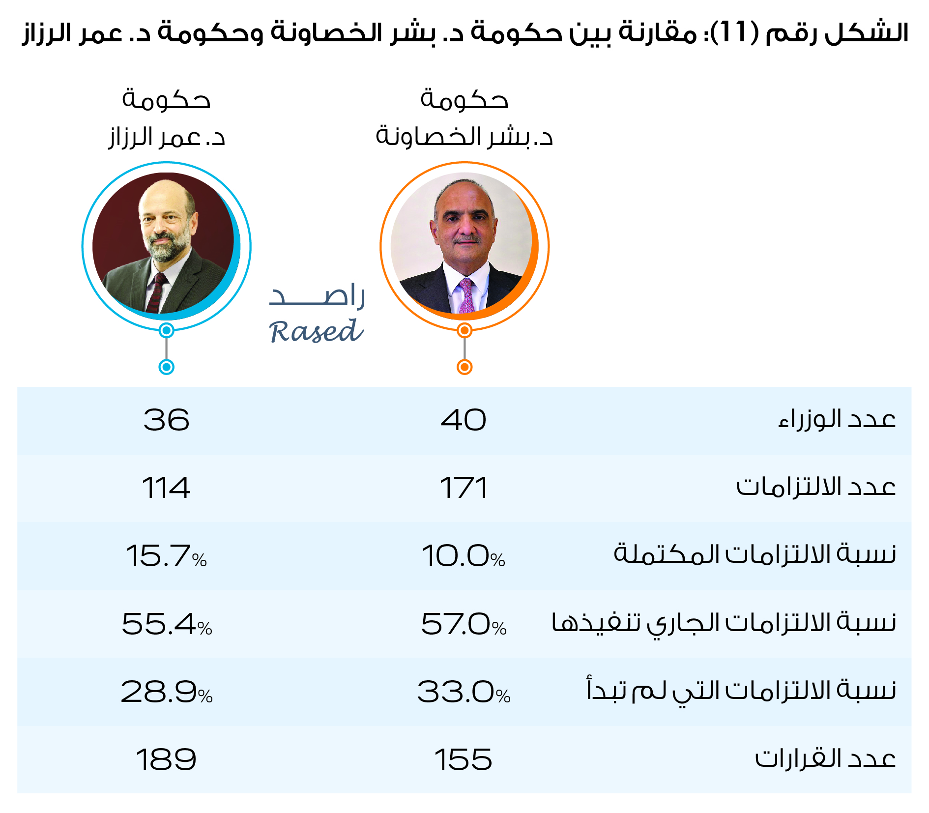 أصدر مركز راصد تقريره الخاص بمراقبة أداء حكومة الدكتور بشر الخصاونة ضمن الفترة الواقعة 12/10/2020ولغاية 12/4/2021، حيث تشكلت حكومة الخصاونة من 40وزيراً من التشكيل الأول وثلاثة تعديلات لتكون الأعلى بعدد الوزراء مقارنة مع آخر ثلاث حكومات حيث كان عدد وزراء حكومة الرزاز 36وزيراً، وحكومة الملقي 36وزيراً، وحكومة النسور 32وزيراً في أول ستة شهور، وبمقارنة عدد الالتزامات التي قدمتها حكومة الخصاونة مع حكومة الرزاز، تبين أن الخصاونة قدم 171 التزاماً اكتمل منها 10%فيما قدم الرزاز 114 التزاماً اكتمل منها 15,7%خلال ستة اشهر، وبلغت القرارات التي أصدرتها حكومة الخصاونة 155 قراراً مقارنةً بـ 189 قراراً لحكومة الرزاز،وفي سياق تحليل التزامات حكومة الخصاونة تبين أن 55%من الالتزامات كانت ضمن محور التنمية والخدمات، تلاها محور الإصلاح الاقتصادي بنسبة 22%ومحور الإصلاح الإداري ومكافحة الفساد بنسبة12%ثم محور سيادة القانون وحقوق الإنسان بنسبة 5%، ومحور الشؤون الخارجية بنسبة 3%، ثم محور الإصلاح السياسي بنسبة 2%ومحور الشفافية ودعم الإعلام بنسبة 1%من مجموع الالتزامات.