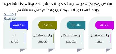 وفيما يتعلق بممارسة الحكومة لمبدأ الشفافية وإتاحة المعلومة للمواطنين والإعلام يرى 4,7% من الأردنيين أن الحكومة مارستها بشكل كبير، بينما يرى 18,4% أن الحكومة مارستها بشكل متوسط، ووصلت نسبة الأردنيين الذين يرون أن الحكومة مارستها بشكل ضعيف إلى 32,1%، وأخيراً لم يرى 44,8% من الأردنيين أن الحكومة مارست مبدأ الشفافية وإتاحة المعلومة للمواطنين والإعلام.
