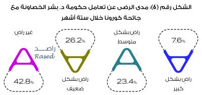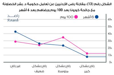 وبينت الدراسة تراجعاً برضا المواطنين عن أداء الحكومة في تعاملها مع جائحة كورونا، حيث كانت 47,1%خلال ال 100يوم الأولى لتصل إلى 31%بعد ستة أشهر، فيما ارتفعت نسبة غير الراضين على تعامل الحكومة مع جائحة كورونا بعد ستة أشهر لتصل الى 42,9%من الأردنيين بينما كان غير الراضين بعد 100يوم على تشكيل الحكومة 28,9%من الأردنيين.