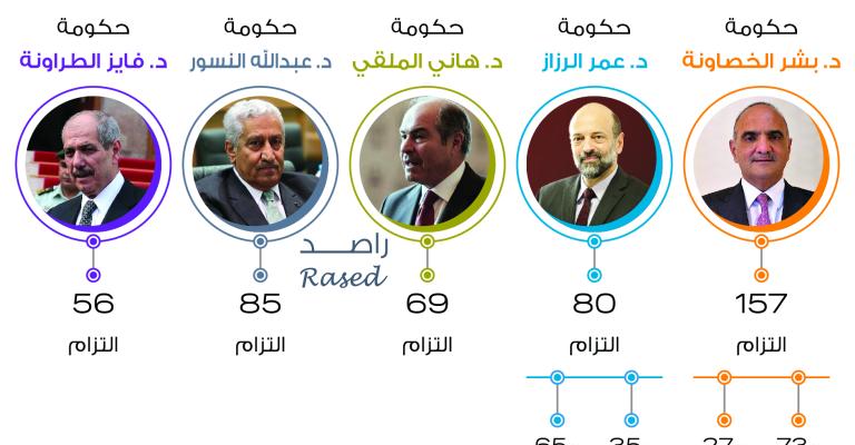 قدمت الحكومة خلال بيانها الوزاري الذي تلته يوم الأحد الموافق 3/1/2020 من خلال رئيس وزرائها الدكتور بشر الخصاونة ما مجموعه 157 التزاماً، وتم تحليل البيان إلى سبعة محاور شاملة وكان محور تعزيز التنمية