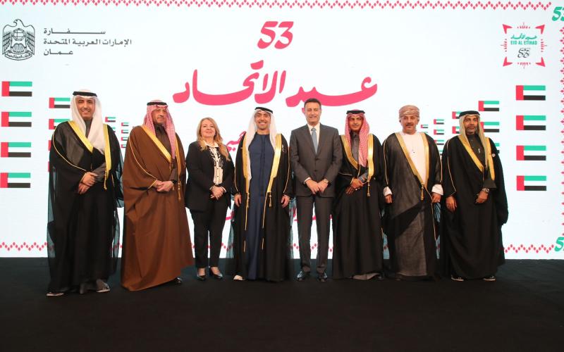 عمان نت - أقامت سفارة دولة الإمارات في عمّان، مساء يوم الاثنين احتفالاً كبيراً بمناسبة عيد الإتحاد الثالث والخمسين لدولة الإمارات العربية المتحدة بالتزامن مع الاحتفال باليوبيل الذهبي لإنشاء العلاقات مع المملكة الأردنية الهاشمية.وكان في مقدمة مستقبلي الضيوف المستشار حمد المطروشي القائم بأعمال سفارة دولة الإمارات في عمّان وأعضاء البعثة الدبلوماسية والعسكرية، حيث حضر الاحتفال كبار المسؤولين الأردنيين، ممثلة بمعالي الدكتورة نانسي نمروقة وزير دولة للشؤون الخارجية وسعادة أحمد الصفدي رئيس مجلس النواب وعدد من أصحاب الدولة رؤساء الوزراء السابقين والوزراء والأعيان والنواب الحاليين والسابقين وكبار رجال السلك الدبلوماسي والعسكري والقضائي ورؤساء البعثات الدبلوماسية العربية والاجنبية وممثلي الفعاليات السياسية والاقتصادية والثقافية والإعلامية ومدراء وقادة مؤسسات المجتمع المدني والمنظمات الدولية، أضافة إلى عدد من شيوخ العشائر في العديد من مناطق المملكة.