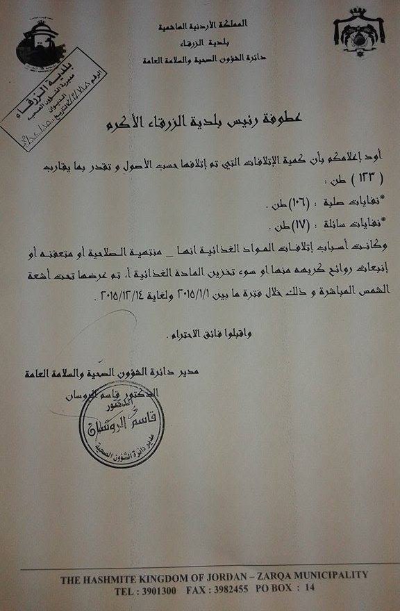 اعلن مدير دائرة الشؤون الصحية والسلامة العامة في بلدية الزرقاء قاسم الروسان، ان مديريته تمكنت من ضبط واتلاف 123 طنا من المواد الغذائية غير الصالحة للاستهلاك البشري خلال العام 2015، وبالتعاون مع الجهات المعنية في المحافظة.