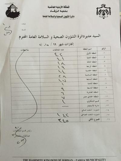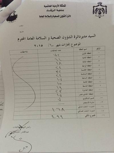 ونوه الى ان فرق الصحة في البلدية تحرر ما معدله اكثر من 400 مخالفة شهريا بحق محال ومصانع مختصة بالمواد الغذائية، مشير الى ان عدد المخالفات بلغ 423 خلال تشرين الثاني و345 في تشرين الاول و499 مخالفة في ايلول.