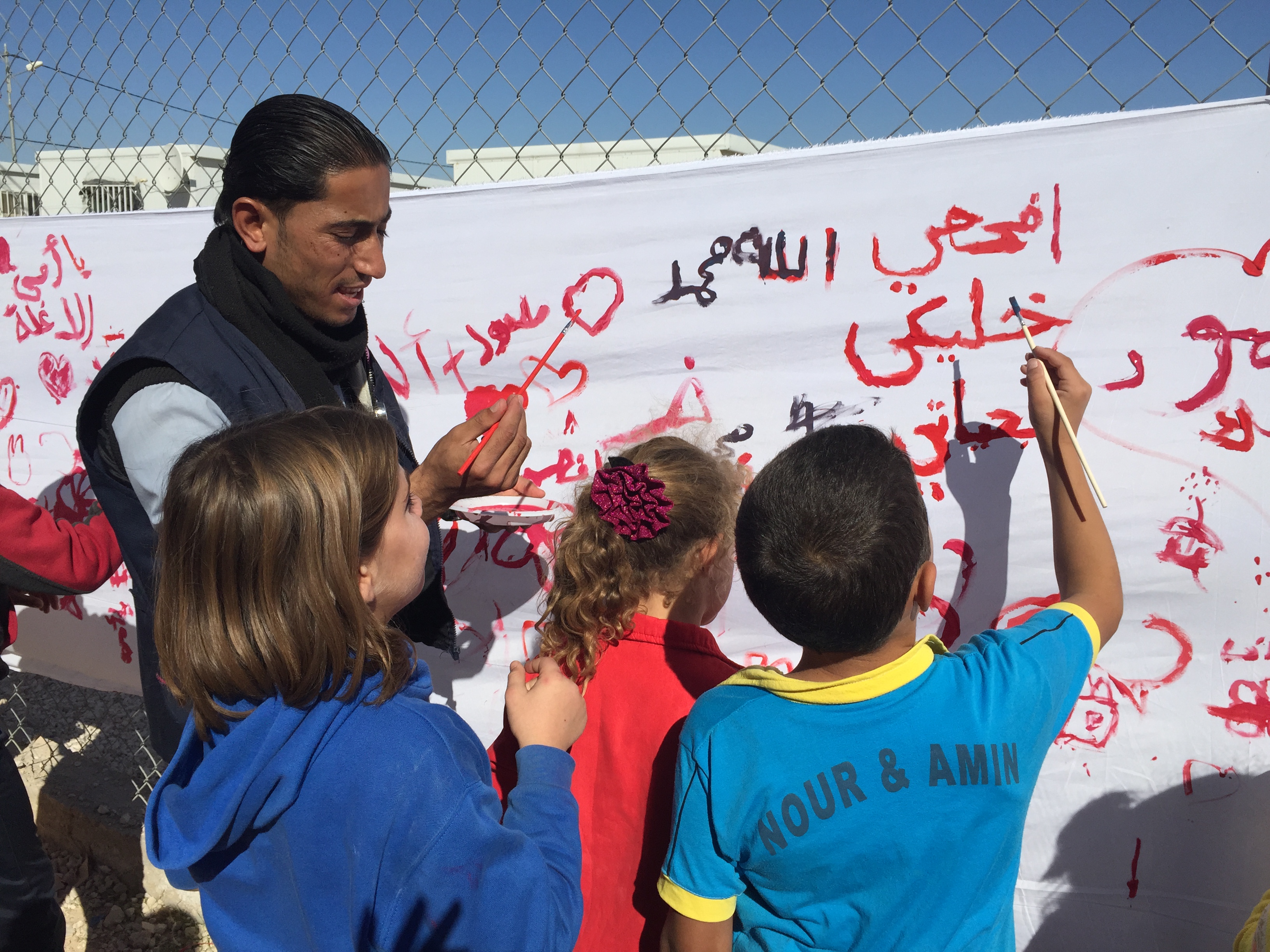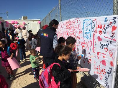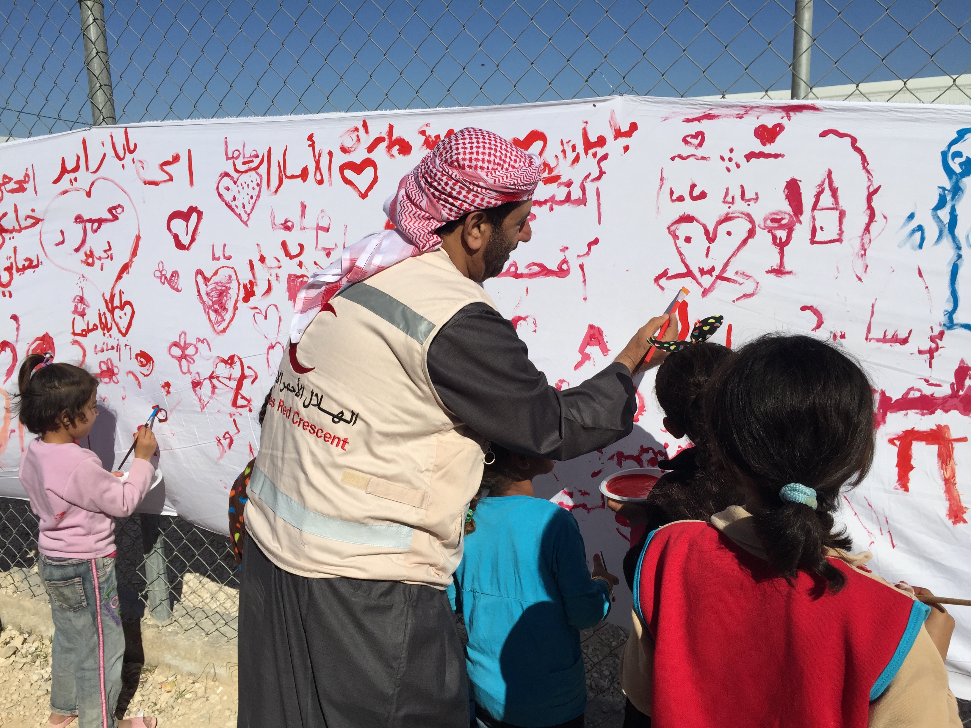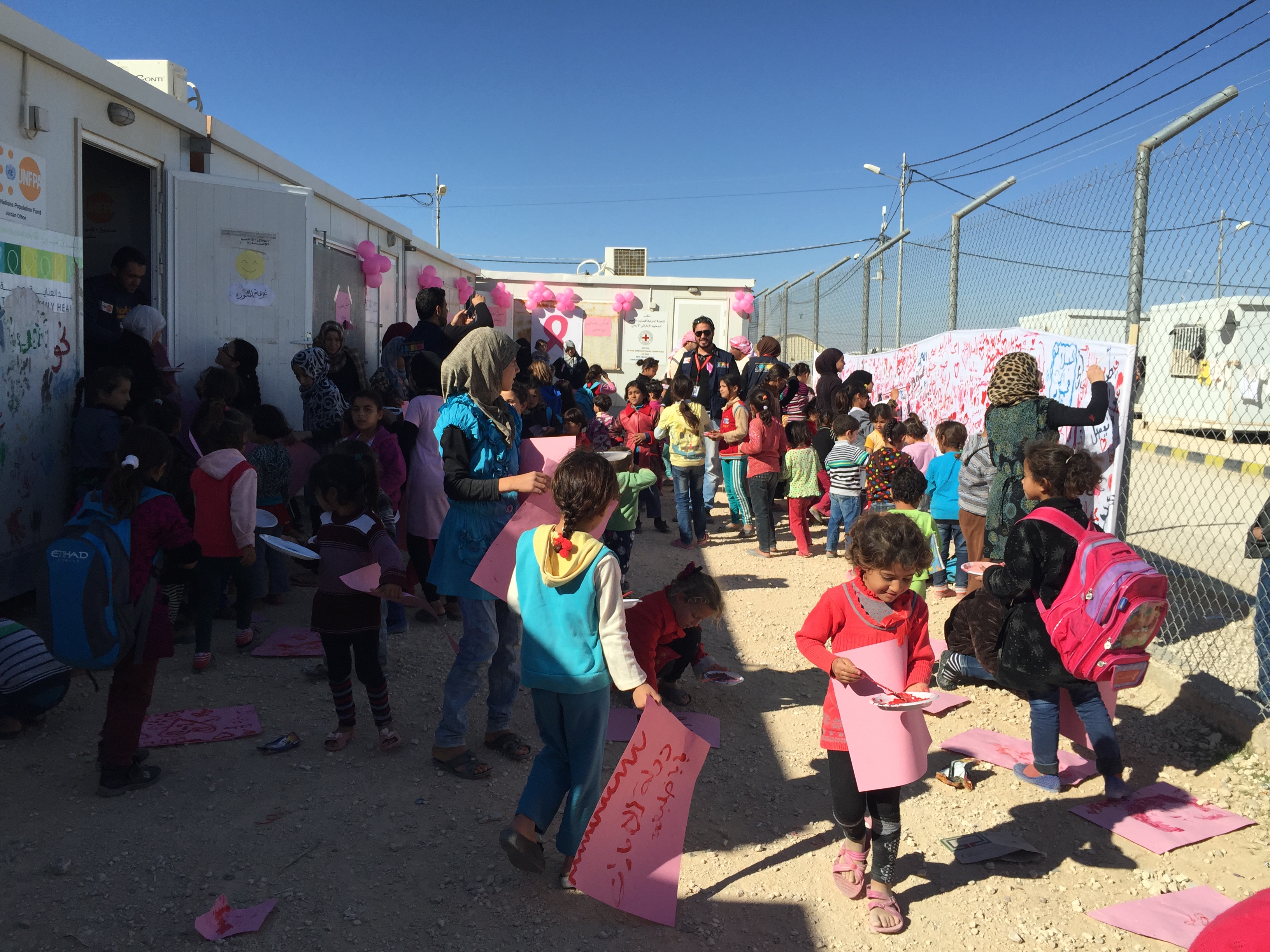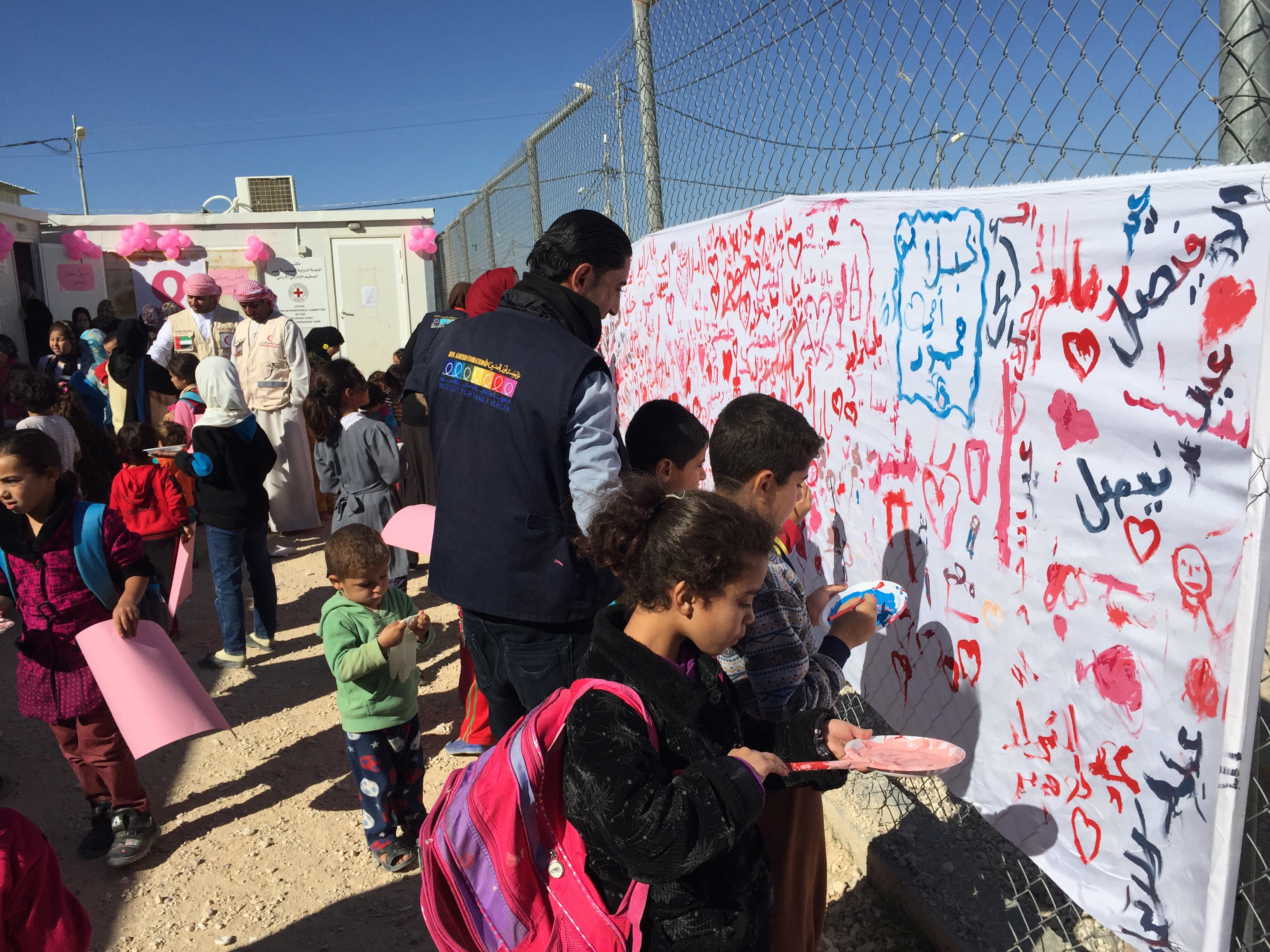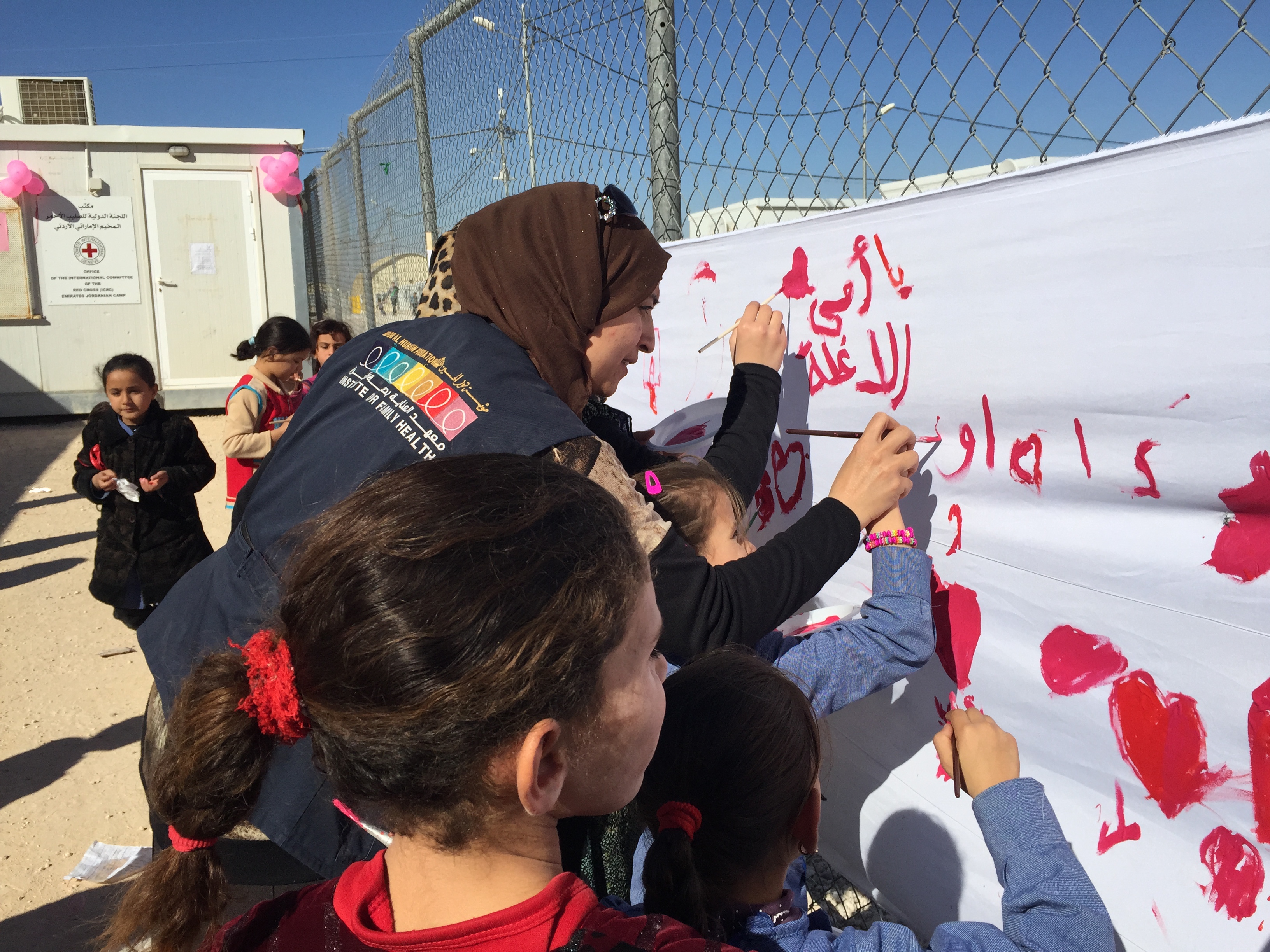 وقام ابناء المشاركات على هامش الجلسات برسم لوحات جدارية تضمنت شعار حملة "خليكي بحياتي..افحصي" وغيرها من العبارات التشجيعية العفوية، وانضم اليهم في ذلك عدد من اعضاء فريق الاغاثة الاماراتي العامل في المخيم.