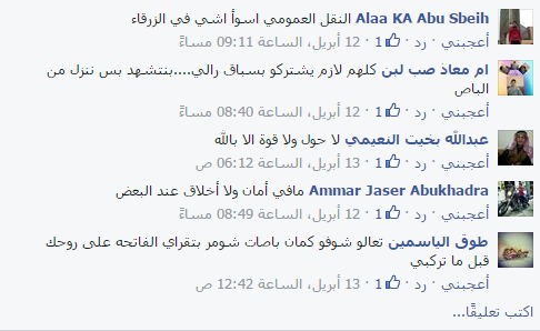 وكتب ((Alaa Herz في ذات السياق قائلا "شارع حي النزهه صواريخ الباصات مش عارف على شو مستعجلين"، وايضا قالت (ام معاذ صب لبن) "كلهم لازم يشتركو بسباق رالي....بنتشهد بس ننزل من الباص ..لا حول ولا قوة الا بالله".