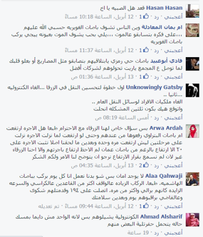وفي تعليق مطول، كتب (Alaa Qahwaji) يقول "لا يوجد امان بس شو بدنا نعمل انا كل يوم بركب بباصات الهاشميه. طبعا. الركاب الزياده عالواقف اكثر من القاعدين عالكراسي والسرعه الزايده كانهم برالي واكثر من مره. اتصلت على ١٩٤ وقدمتلهم شكوى وعالفاضي براقبوهم يوم وبعدين سلامتك والله لو ايمن بيك يلبس مدني وينزل عالباصات او يوقف يستنى تكسي سايقه فايع ومركب مسجل عالاخر ومش سال عن حد بيكون احسن من برنامج عالاذاعه".