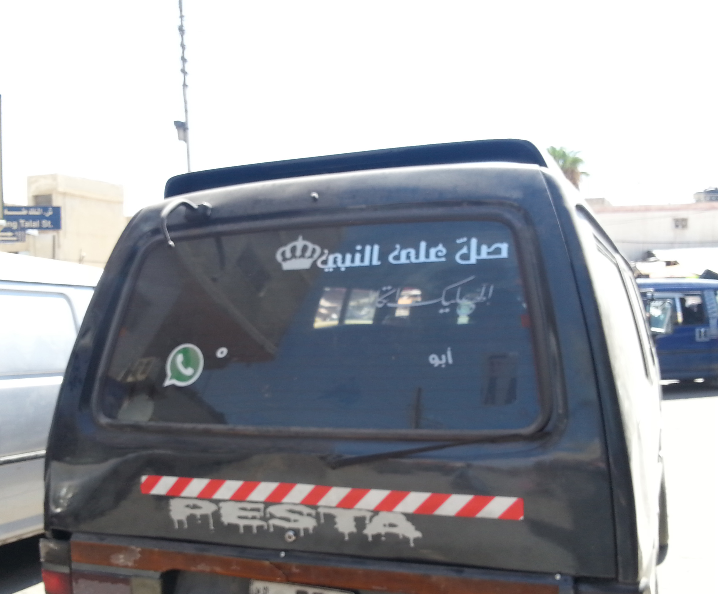 وطالب الزواهرة الشرطة بالتدخل لازالة مثل هذه العبارة وسواها عن السيارات في الزرقاء. علما ان القانون يمنع الملصقات والكتابات على المركبات.